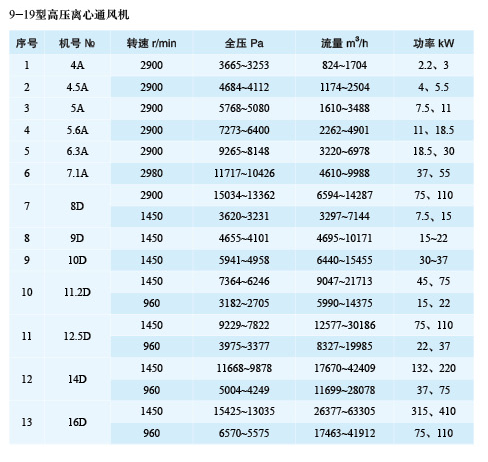型式:本風機為單吸入式,通常有№4、 4.5、5、5.6、 6.3、7.1、8、9、10、11.2、12.5、14、16共13個機號。